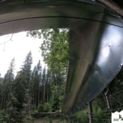 El recinto de “acomodación” (el primero en el que se alojan los oseznos recién llegados) es el primero y el más pequeño, con forma redonda y unos 40 metros de diámetro. Como todos los cercados del centro, está hecho con postes de madera maciza (roble y acacia) que tienen aproximadamente entre 1,5 y 2 metros de altura y entre 7 y 15 centímetros de ancho, separados entre sí unos 2 metros. El vallado consiste en una malla metálica que se fija a los postes y está enterrada en el suelo a una profundidad de 30-40 centímetros. Lo que caracteriza a este recinto es que los cables eléctricos en el interior del mismo están colocados más cerca unos de otros, ya que aquí los cachorros aún son pequeños (2-5 meses de edad). El primer cable se coloca a unos 5 cm del suelo y los otros 6 cables se colocan a 10 cm de distancia unos de otros. Partiendo aproximadamente de la mitad de la altura de los postes de madera, se han añadido placas metálicas curvadas hacia el interior del recinto para así evitar que los oseznos salgan del recinto hasta que aprendan a evitar las vallas. En el exterior del recinto hay 4 cables eléctricos colocados a unos 40 cm uno del otro para evitar que entren osos salvajes y otros depredadores.